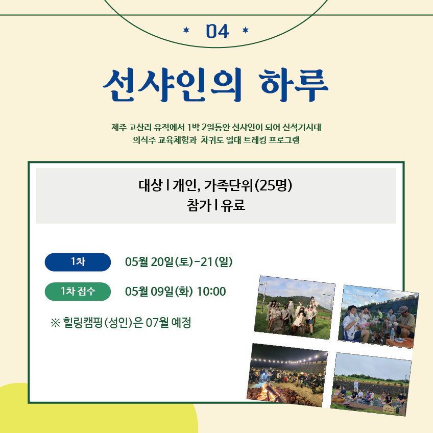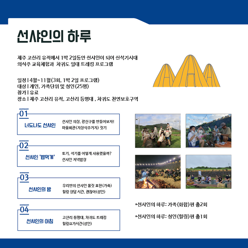 - 내 용: 제주 고산리 유적에서 1박2일 동안 선샤인이 되어 신석기시대 의식주 교육체험과 차귀도 일대 트레킹 프로그램