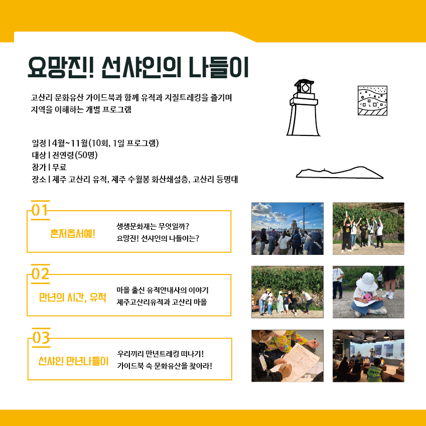 - 내 용: 고산리 문화유산 가이드북과 함께 유적과 지질트레킹을 즐기며 지역을 이해하는 개별프로그램